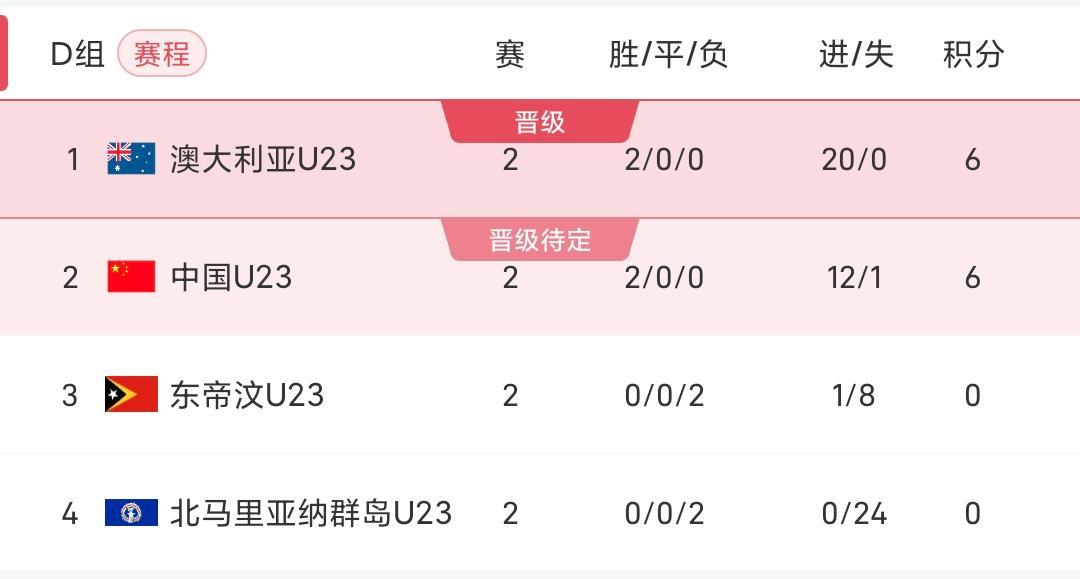 首轮国青2-1击败东帝汶,目前已手握11粒净胜球,暂居D组第二。澳大利亚U23同积6分排在榜首,前两轮澳大利亚分别14-0北马里亚纳群岛、6-0东帝汶,手握20粒净胜球。